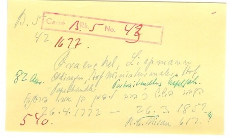 | Person: FRAENCKEL, Liepmann portrætmaler, tapetfabrikant, Hebr. navn: Lipman ben Uri Frenkel Begravelsesdato: 1857,26.3 Begravelsesplads: Møllegade (Kbh.) B-5-43 Legat identificeret sten- se nabobegravelserne i rækken *) Krydsreferencer: Dansk-Jødisk Genealogisk Database (kræver SDJH-medlemskab) |