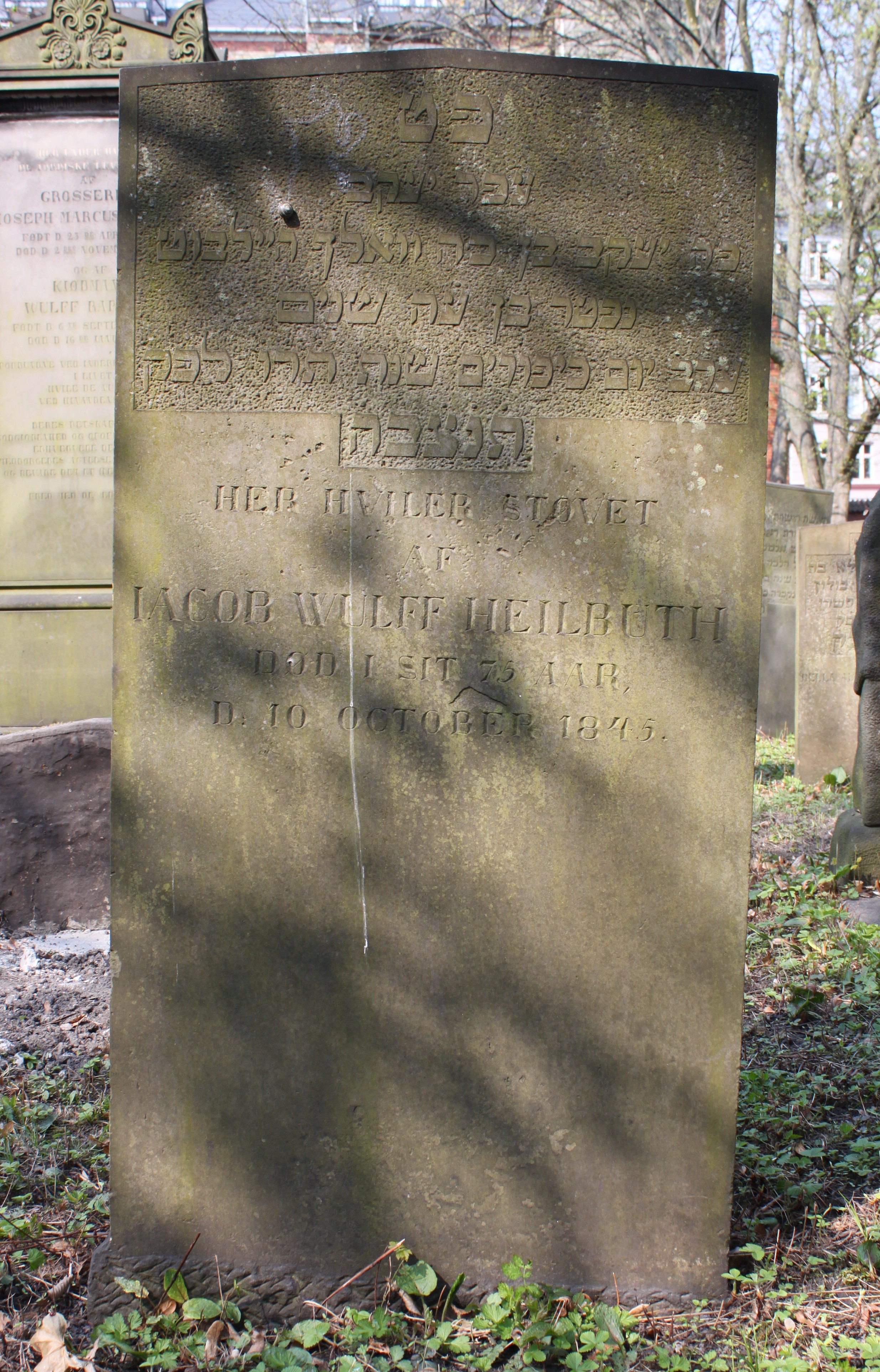 | Person: HEILBUTH, Jacob Wulff købmand, Hebr. navn: Jokev ben Wolf Heilbut Begravelsesdato: 1845,10.10 Begravelsesplads: Møllegade (Kbh.) G-9-11 identificeret sten- se nabobegravelserne i rækken *) Krydsreferencer: Dansk-Jødisk Genealogisk Database (kræver SDJH-medlemskab) |
