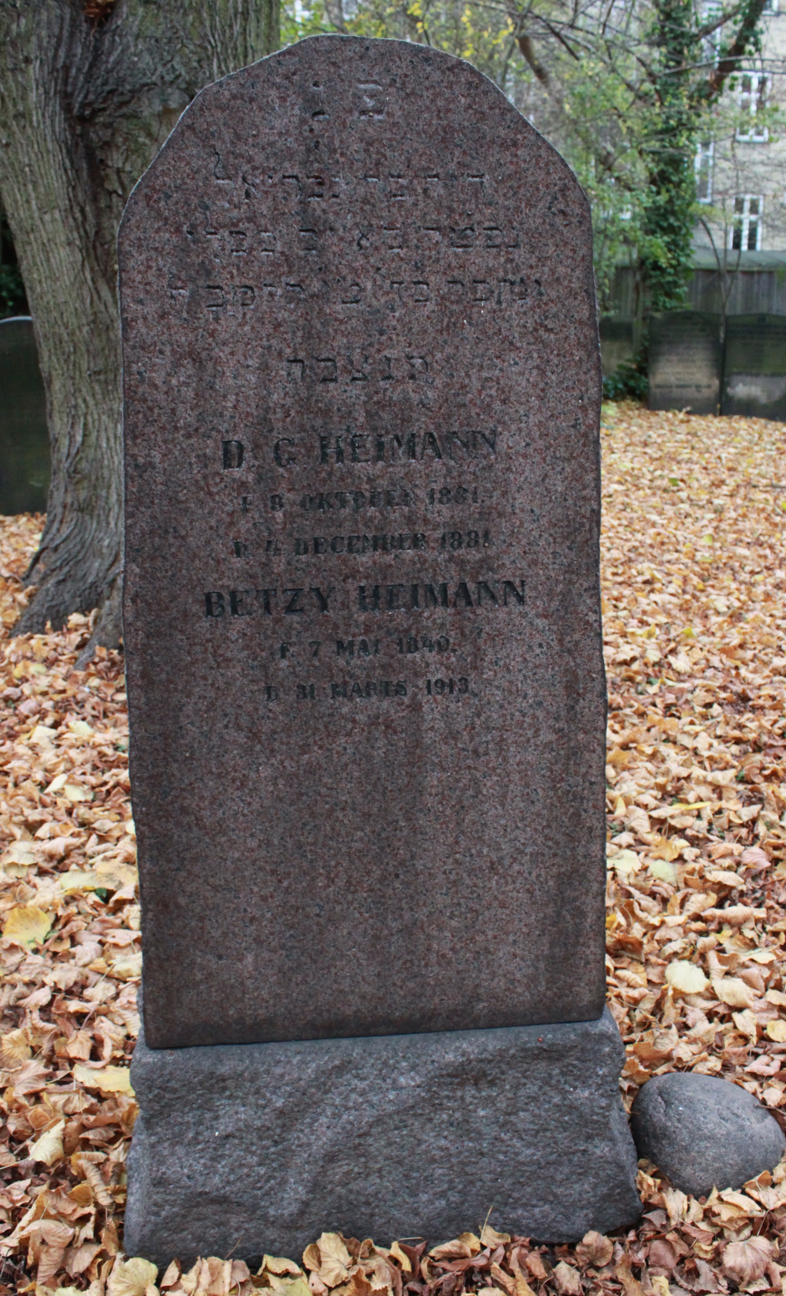 | Person: HEIMAN (HEIMANN), David Gabriel drejermester, Begravelsesdato: 1881,4.12 Begravelsesplads: Møllegade (Kbh.) J-24-2 Legat identificeret sten- se nabobegravelserne i rækken *) Note: Fælles sten med ægtefælle Krydsreferencer: Dansk-Jødisk Genealogisk Database (kræver SDJH-medlemskab) |