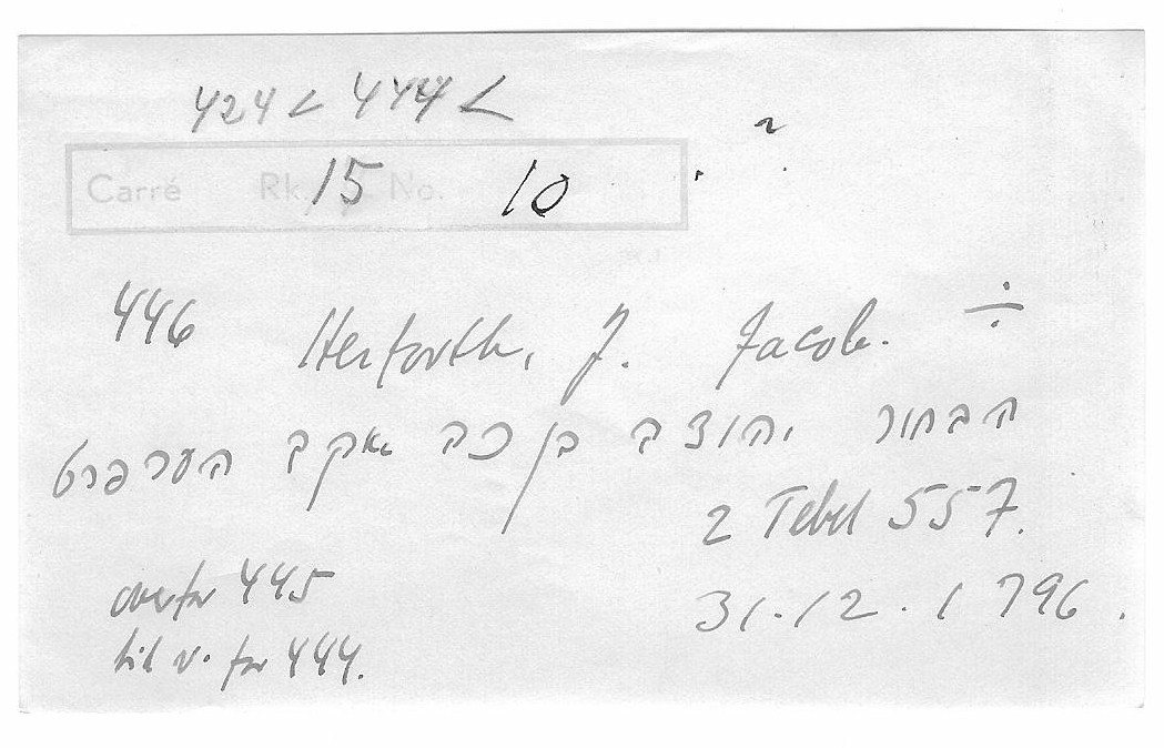 | Person: HERFORTH (HERFORT), Levin Jacob Hebr. navn: ha bachor Jehuda ben Jokev Herfort Begravelsesdato: 1796,31.12 Begravelsesplads: Møllegade (Kbh.) X-15-10 0 grav/ingen sten- se nabobegravelserne i rækken *) Krydsreferencer: Dansk-Jødisk Genealogisk Database (kræver SDJH-medlemskab) |