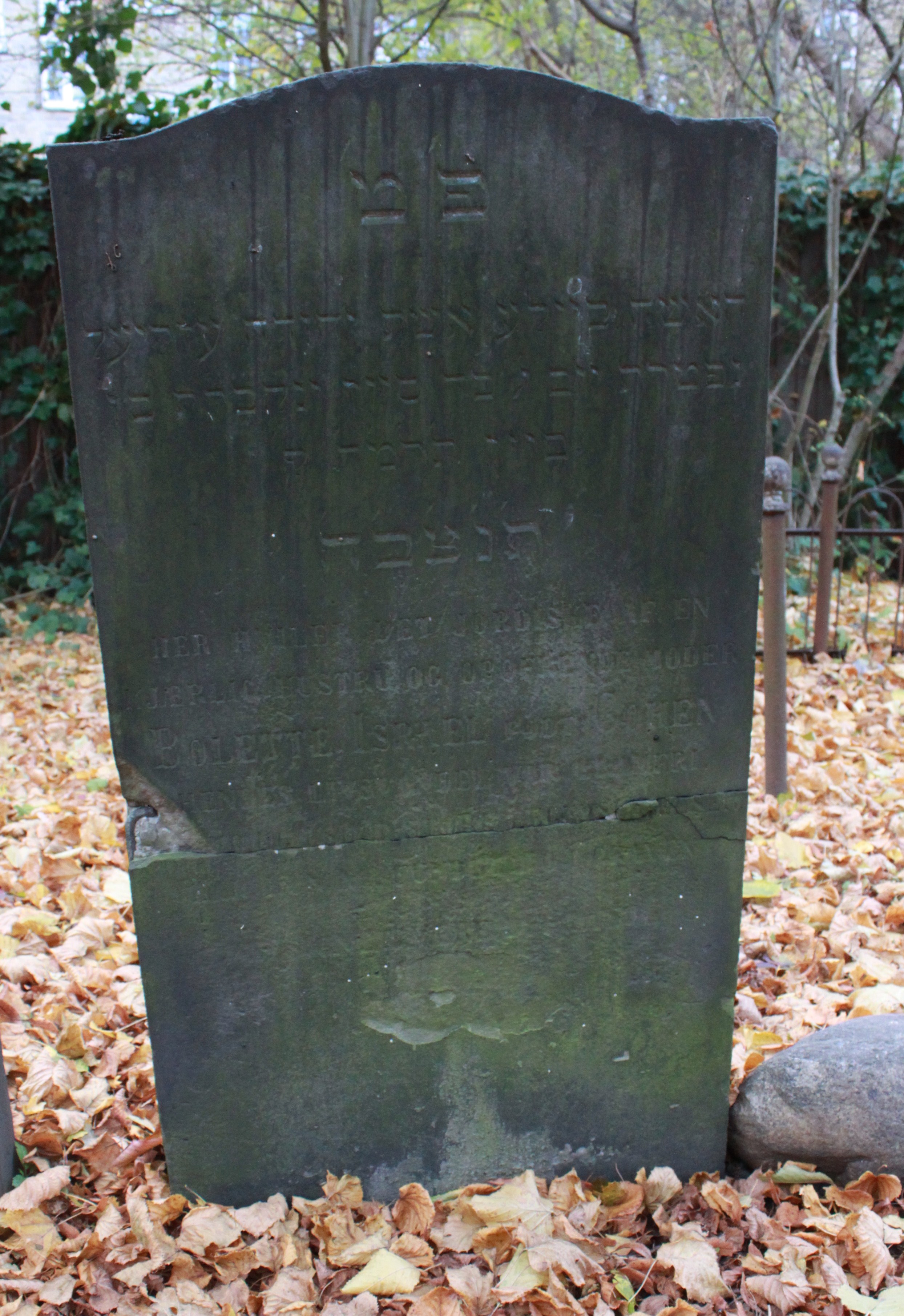 | Person: ISRAEL, Bolette née Cohen/Cohn, married to Levin [ISRAEL] - spouse J-26-6-Mlgd Hebr. name: Beile Date of burial: 1884,17.6 Place of burial: Mollegade (Cph.) J-26-5 identified stone- see neighbouring burials in the row *) Cross-references: Danish-Jewish Genealogical Database (requires membership of SDJH) |