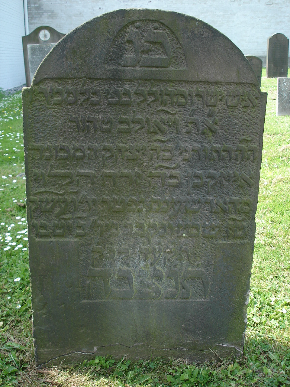 Den hebraiske gravskrift: Her hviler en retskaffen Mand, lovprist af alle, der kendte ham. En from og gudsfrygtig Mand af et rent Hjerte.