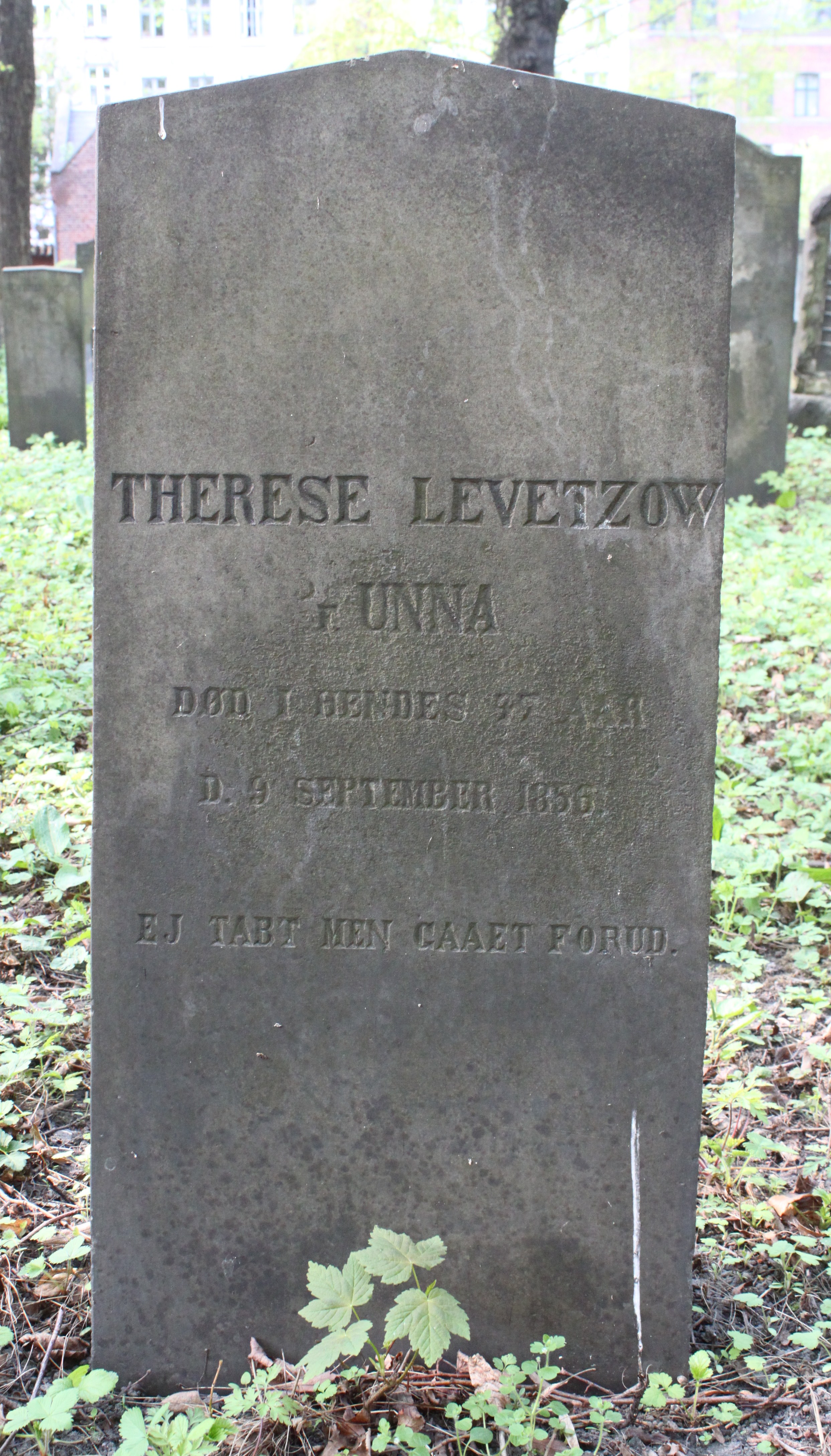| Person: LEVETZOW, Therese fødenavn Unna, gift med Abraham [LEVETZOW] Begravelsesdato: 1856,9.9 Begravelsesplads: Møllegade (Kbh.) B-5-14 Legat identificeret sten- se nabobegravelserne i rækken *) Note: Mands fornavn mangler i JD Krydsreferencer: Dansk-Jødisk Genealogisk Database (kræver SDJH-medlemskab) |