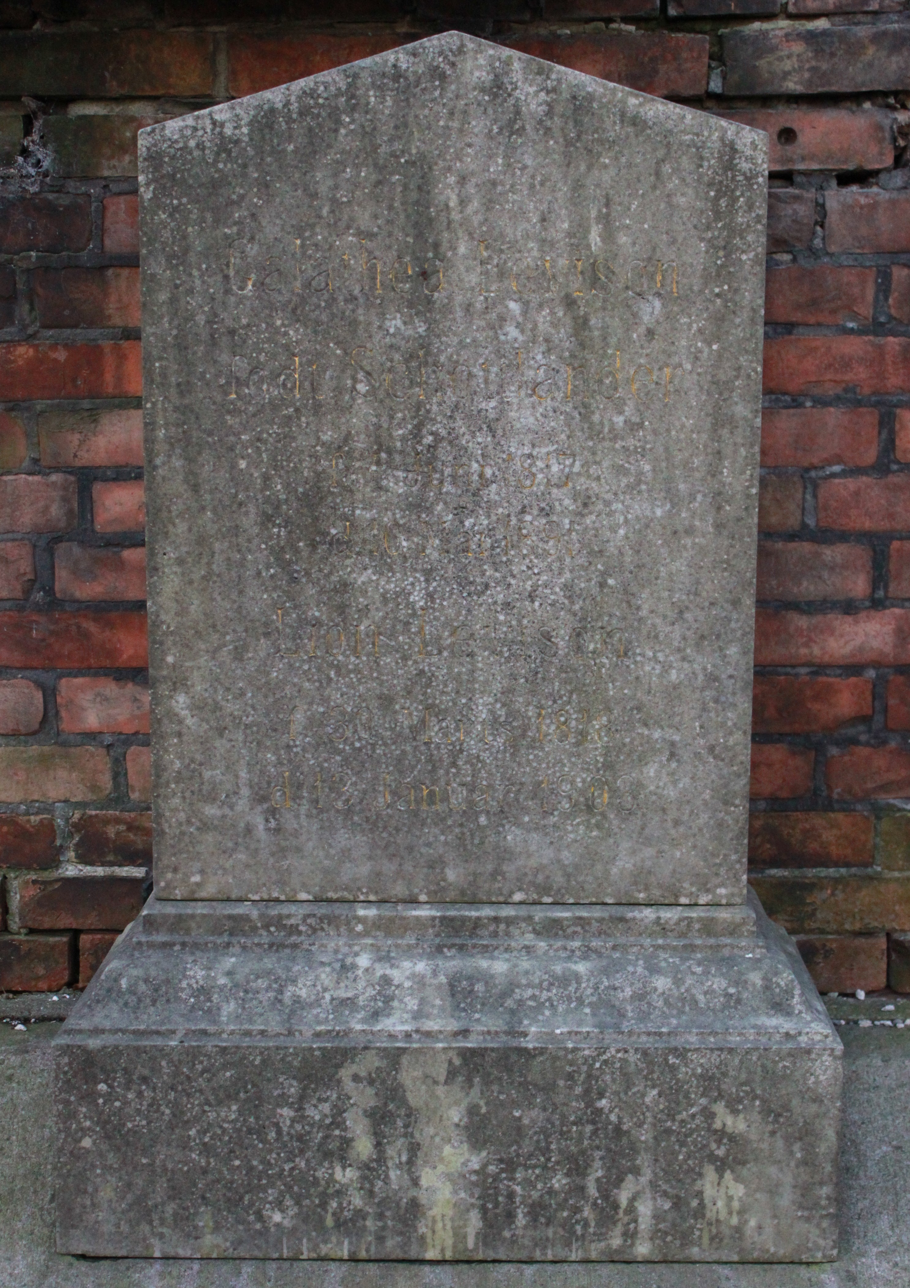 | Person: LEVISON, Galethea fødenavn Schottländer, gift med Lion [LEVISON] - ægtefælle MB-79-Mlgd Begravelsesdato: 1891,10.5 Begravelsesplads: Møllegade (Kbh.) MB-78 Legat identificeret sten- se nabobegravelserne i rækken *) Note: Fælles sten med ægtefælle Krydsreferencer: Dansk-Jødisk Genealogisk Database (kræver SDJH-medlemskab) |