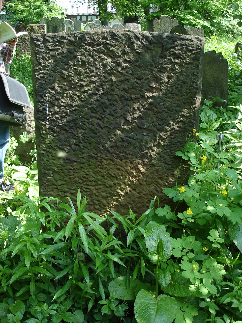 Historisk foto fra Mindeskrift (før 1914) hhv. Gravminder (1912). Den hebraiske gravskrift: Dette var Levitens Tjeneste, den hellige Tjeneste. Hans Disciple og samtidige jamrer og klager over Tabet af deres Overhoved. Hans Børn istemmer Klagesang, græder og sukker bittert over deres Pryd. Thi bortkaldt fra Jorden blev den fromme, der stod i Brechen og hegnede Murene. Rejser Mindestøtte til Erindring for de seneste Slægter om den Dag, paa hvilken Døden traadte i ud i vore Højsale og borttog Hjordens Hyrde. Da knustes vore stærke Mure, nedbrødes vor Fæstning, vore Telte styrtede sammen, da Hovedsøjlen blev knækket og Teltsnoren sprængtes. Vor Herre, vor Pryd og Styrke, det vidtberømte Lys, Rabbiner Zevi Hirsch, Søn at den afdøde berømte Rabbiner Samuel ha-Levi den frommes Minde være til Velsignelse -, som har beklædt Rabbiner-Embeder i over 50 Aar, (først) i hellige Menigheder i Polen og over vor Menighed straalede hans Lys i over 30 kar, han steg op til Himlen i den Maaned, som har bragt os dobbelt Ulykke, i Aaret "det var jo paa den Dag, da jeg tog deres Styrke, deres herlige Glæde," 4. Tebeth (5)536. (27. December 1775.). Hans Sjæl vorde indesluttet i de levendes Kreds! (Mindeskrift)