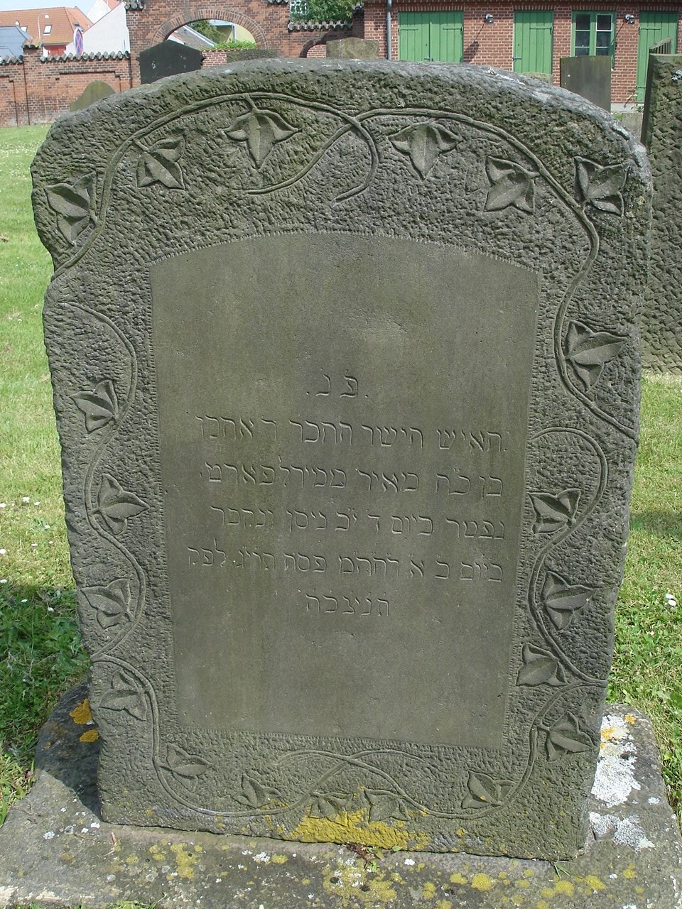 Den danske gravskrift: Ahron Meyer. Kiøbmand i Middelfart, fød i det Brunsvigske d. 25. december 1783, død d. 20. April 1853