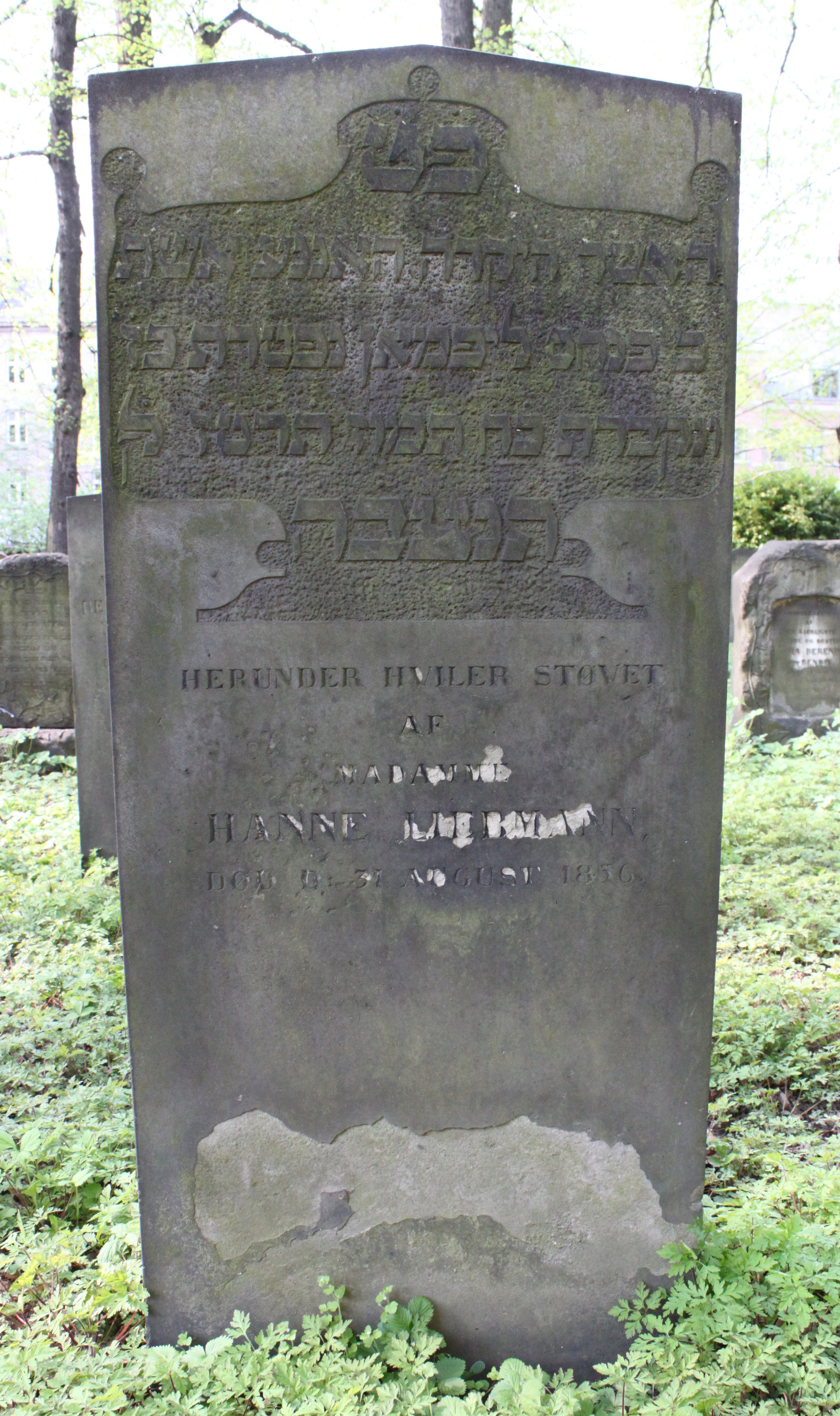 | Person: LIEBMANN, Hanne fødenavn Cohen/Cohn, gift med Pinchas [LIEBMANN] Hebr. navn: Hanne ischat Pinchas Begravelsesdato: 1856,30.7 Begravelsesplads: Møllegade (Kbh.) B-5-8 identificeret sten- se nabobegravelserne i rækken *) Krydsreferencer: Dansk-Jødisk Genealogisk Database (kræver SDJH-medlemskab) |