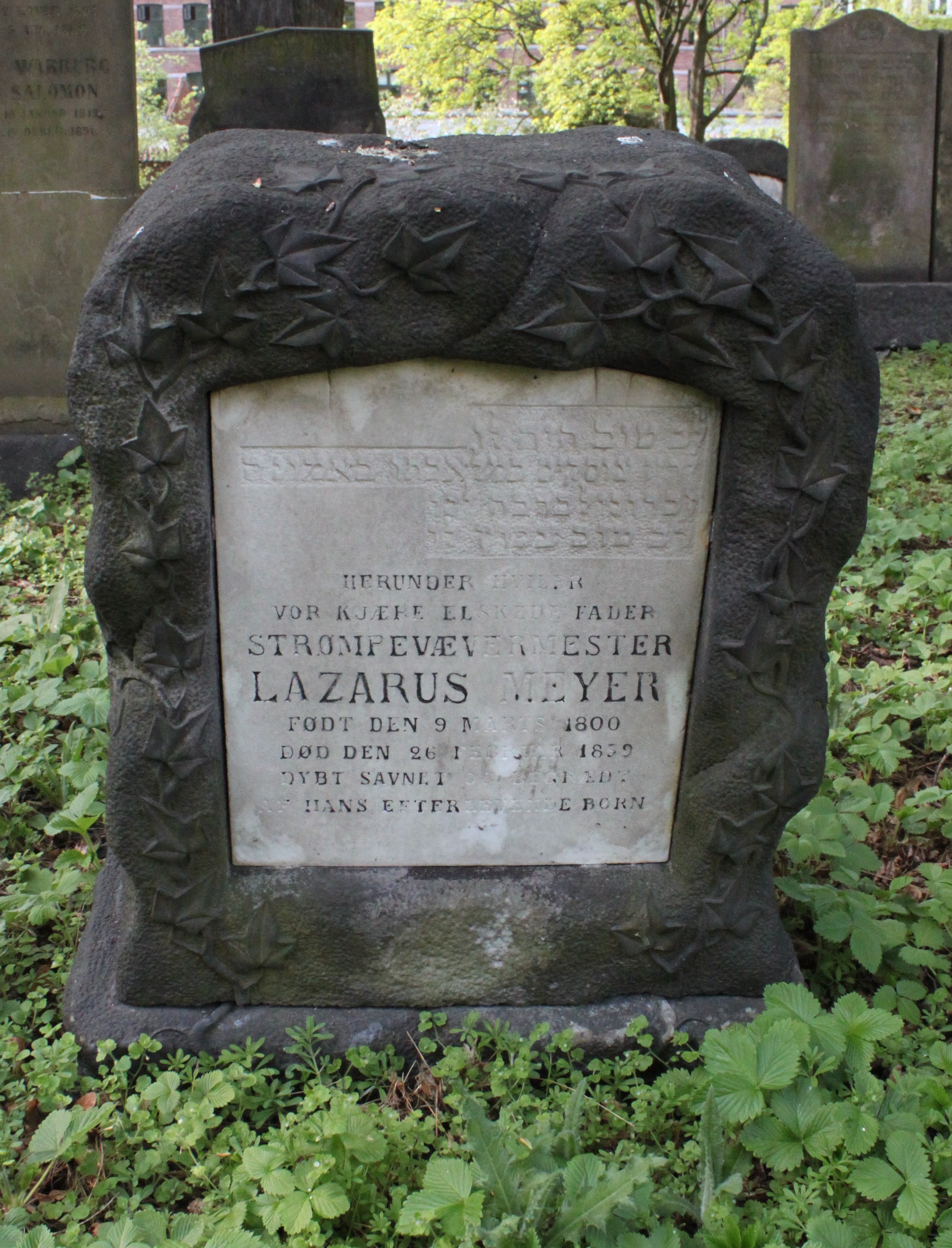 | Person: MEYER, Lazarus - kaldt "Lazarus MOISLING" strømpevævermester, Hebr. navn: Lezer b´r Meir Meisling Begravelsesdato: 1859,25.2 Begravelsesplads: Møllegade (Kbh.) B-8-38 Legat identificeret sten- se nabobegravelserne i rækken *) Krydsreferencer: Dansk-Jødisk Genealogisk Database (kræver SDJH-medlemskab) |