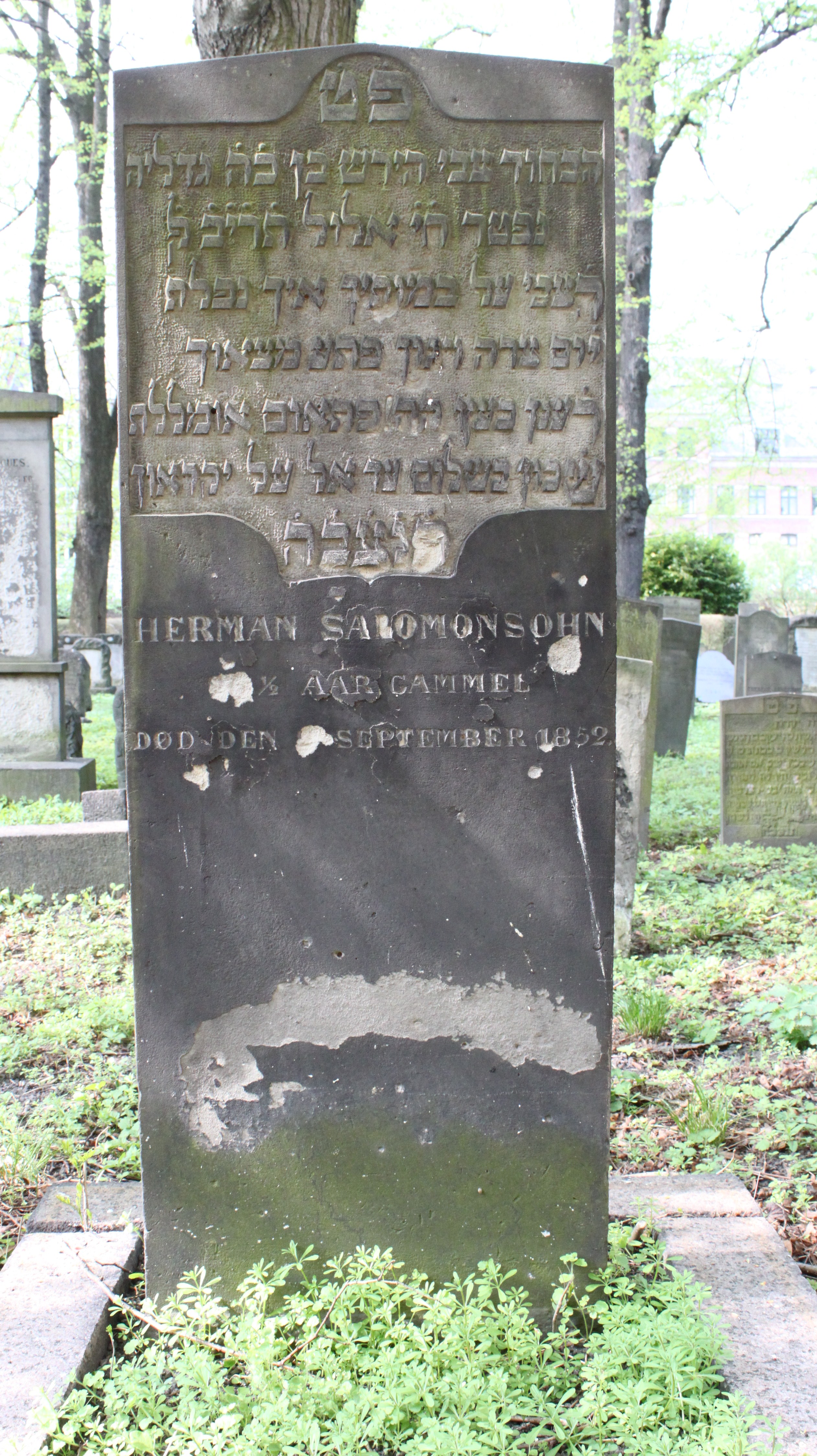 | Person: SALOMONSEN, Herman mægler, Hebr. navn: Zevi Hirsch ben Gedalia Begravelsesdato: 1852,2.9 Begravelsesplads: Møllegade (Kbh.) B-1-12 Legat identificeret sten- se nabobegravelserne i rækken *) Krydsreferencer: Dansk-Jødisk Genealogisk Database (kræver SDJH-medlemskab) |