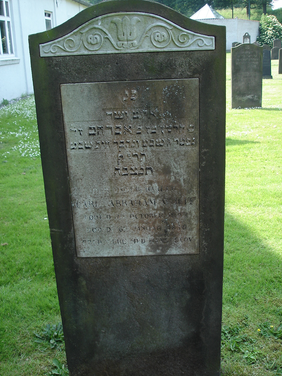 | Person: WULFF (WULF), Carl Abraham garvermester, f. 11.10.1797, Hebr. navn: Klymen ben Avraham z´l Begravelsesdato: 1850,16.1 Begravelsesplads: Fredericia B-19-10 Legat identificeret sten- se nabobegravelserne i rækken *) Krydsreferencer: Dansk-Jødisk Genealogisk Database (kræver SDJH-medlemskab) |
