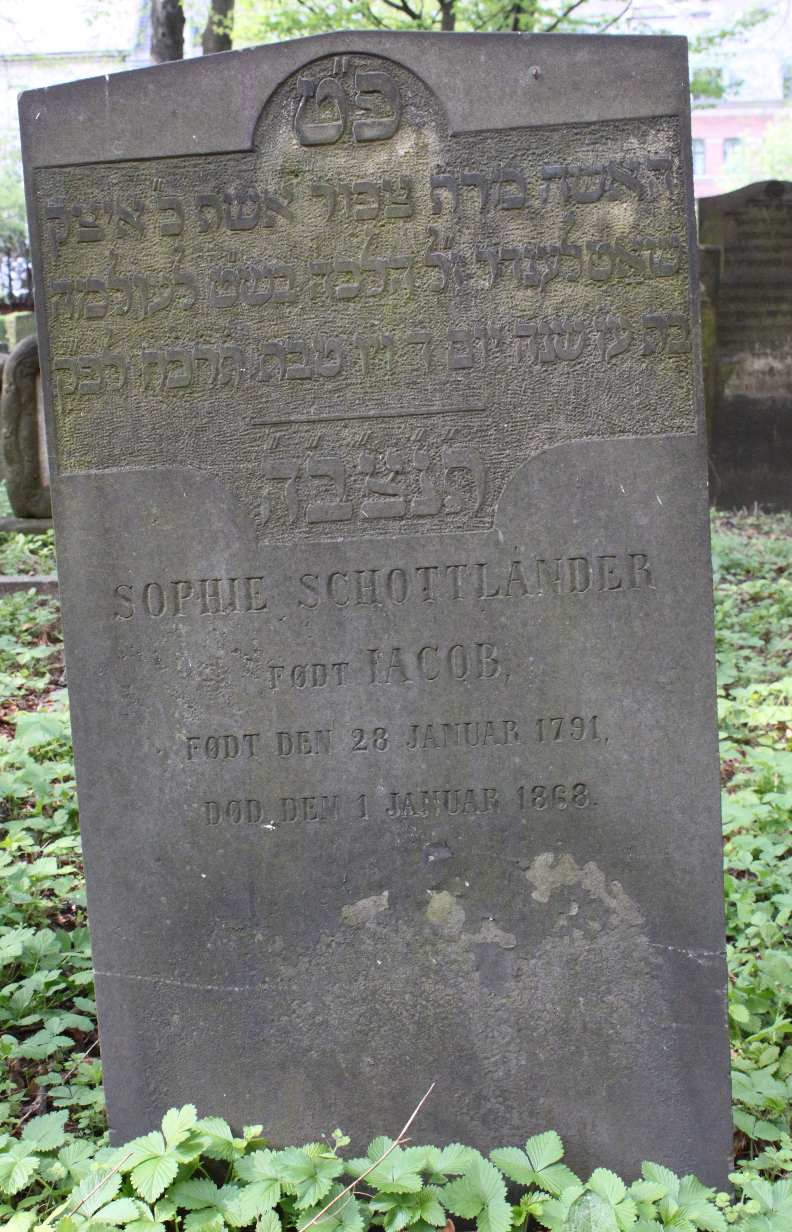 | Person: SCHOTTLäNDER, Sophie fødenavn Jacob, gift med Itzig Ahron [SCHOTTLäNDER] - ægtefælle B-1-21-Mlgd Hebr. navn: Zipor Begravelsesdato: 1868,1.1 Begravelsesplads: Møllegade (Kbh.) B-1-22 identificeret sten- se nabobegravelserne i rækken *) Note: Fødenavn mangler i JD Krydsreferencer: Dansk-Jødisk Genealogisk Database (kræver SDJH-medlemskab) |