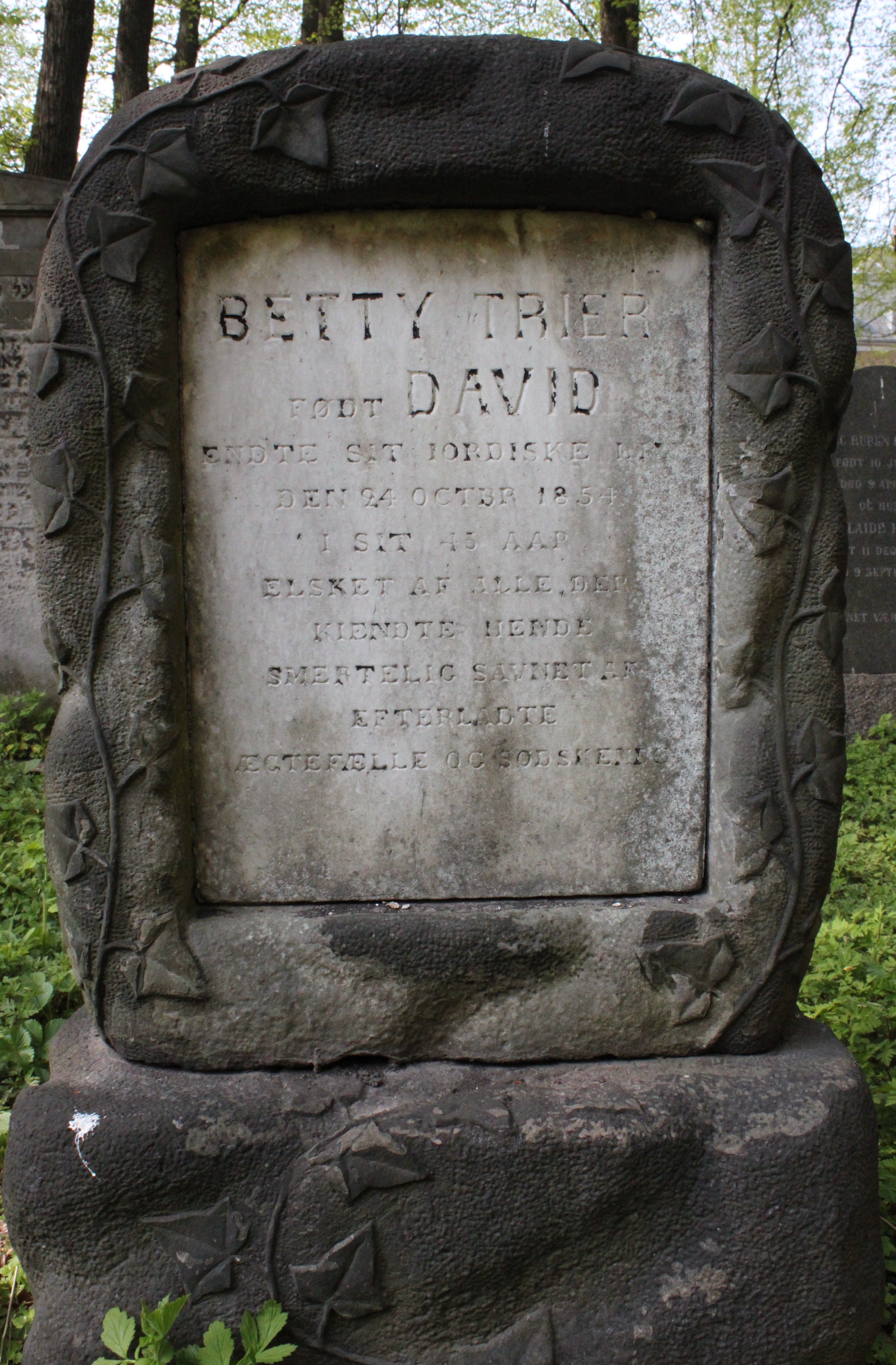 | Person: TRIER, Betty fødenavn David, gift med Salomon Levin [TRIER] - ægtefælle B-3-6-Mlgd Begravelsesdato: 1854,24.10 Begravelsesplads: Møllegade (Kbh.) B-3-5 Legat identificeret sten- se nabobegravelserne i rækken *) Krydsreferencer: Dansk-Jødisk Genealogisk Database (kræver SDJH-medlemskab) |