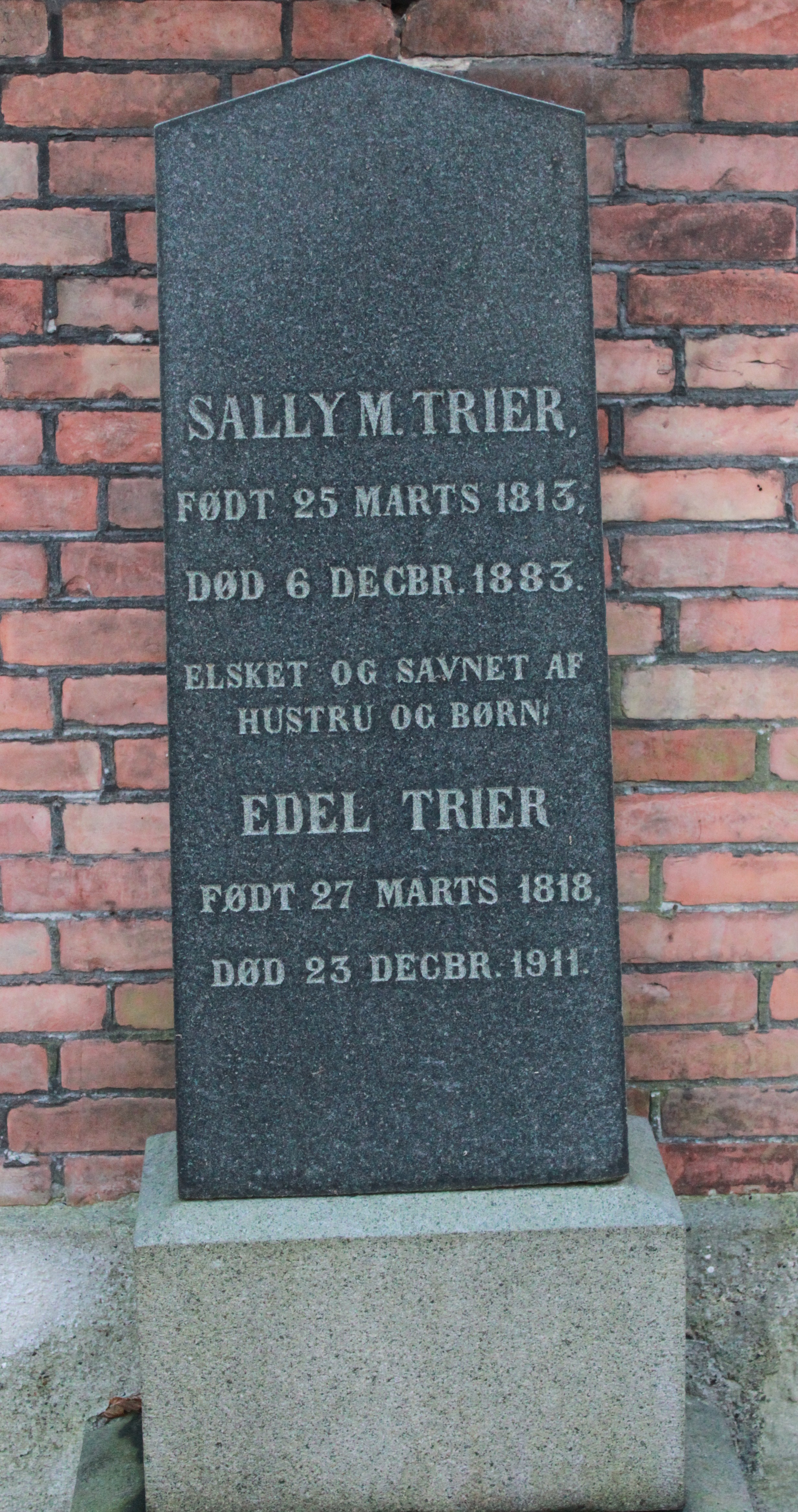 | Person: TRIER, Edel fødenavn Trier, gift med Sally Meyer [TRIER] - ægtefælle MB-34-Mlgd Begravelsesdato: 1911,23.12 Begravelsesplads: Møllegade (Kbh.) MB-35 Legat identificeret sten- se nabobegravelserne i rækken *) Note: Fælles sten med ægtefælle Krydsreferencer: Dansk-Jødisk Genealogisk Database (kræver SDJH-medlemskab) |