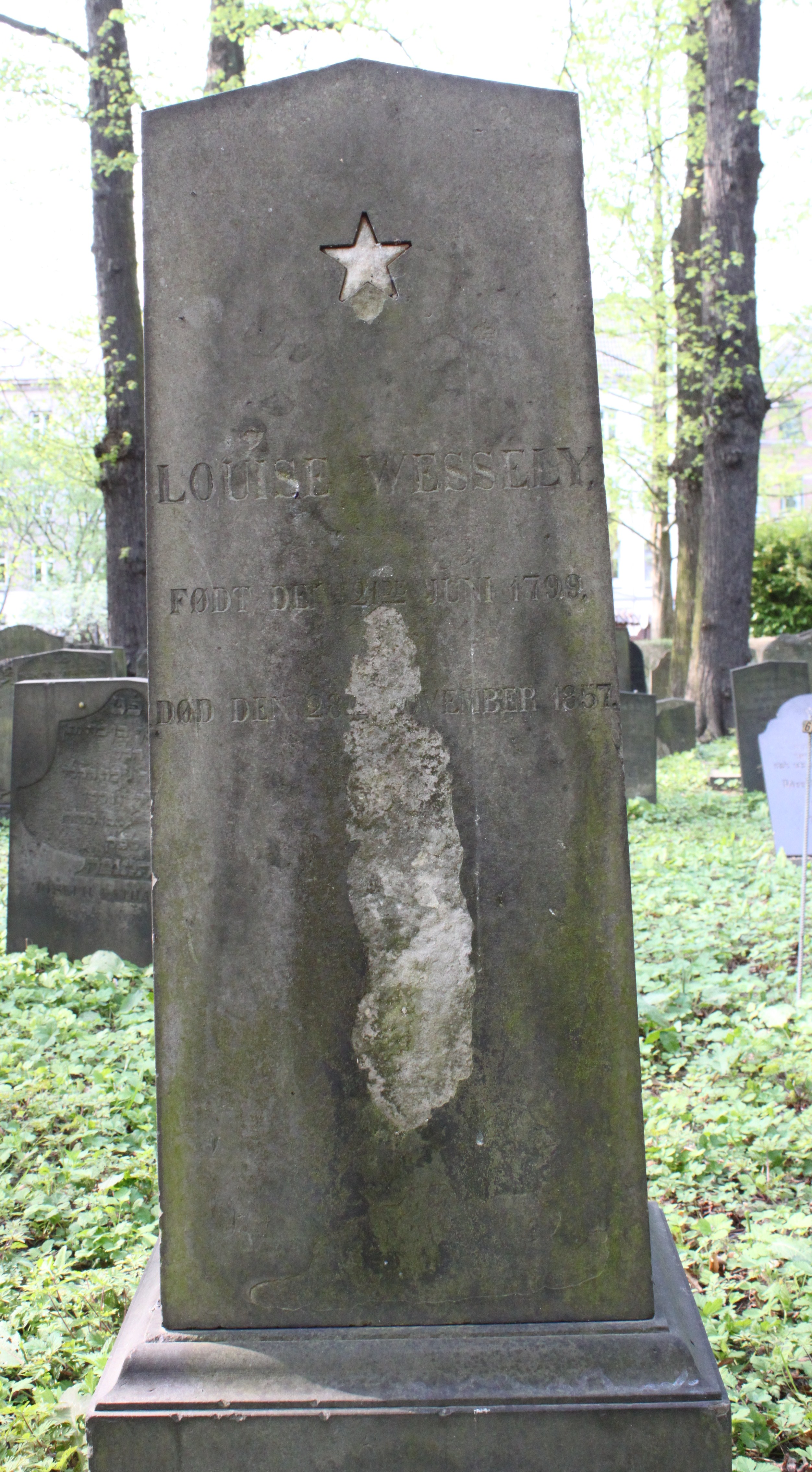 | Person: WESSELY, Louise ugift, Begravelsesdato: 1857,29.11 Begravelsesplads: Møllegade (Kbh.) B-6-11 identificeret sten- se nabobegravelserne i rækken *) Krydsreferencer: Dansk-Jødisk Genealogisk Database (kræver SDJH-medlemskab) |