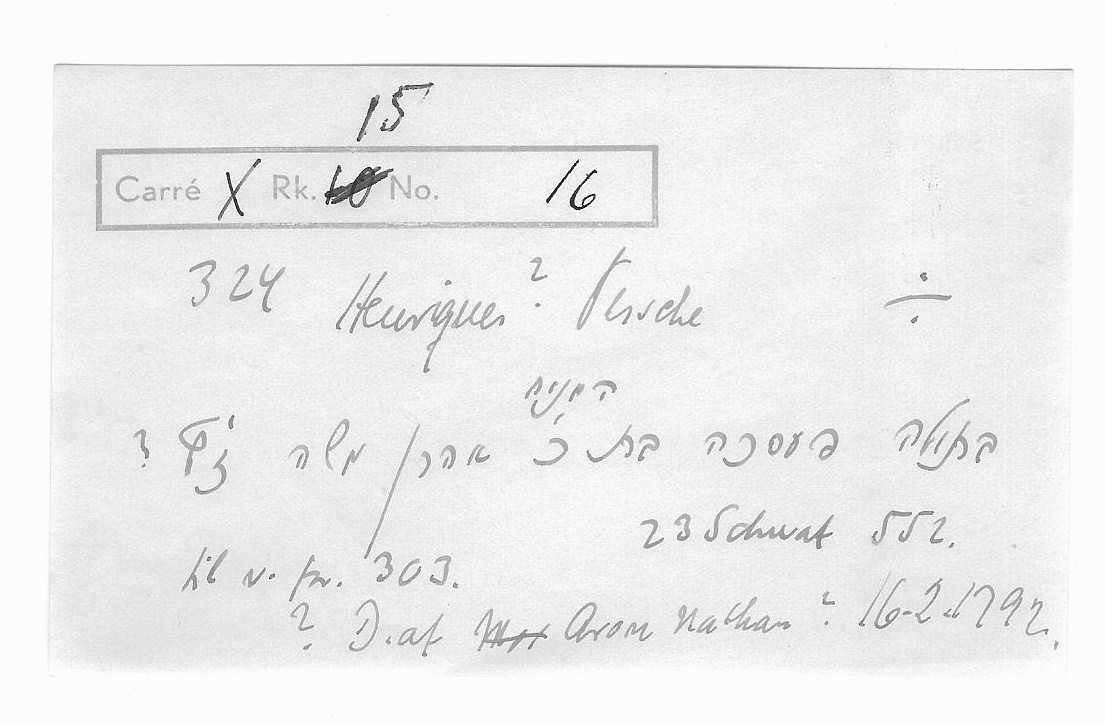 | Person: HENRIQUES, Pesche Hebr. navn: Pesche bat Aharon Mosche Begravelsesdato: 1792,16.2 Begravelsesplads: Møllegade (Kbh.) X-14/15-16 0 grav/ingen sten- se nabobegravelserne i rækken *) Note: mangler i JD Krydsreferencer: Dansk-Jødisk Genealogisk Database (kræver SDJH-medlemskab) |